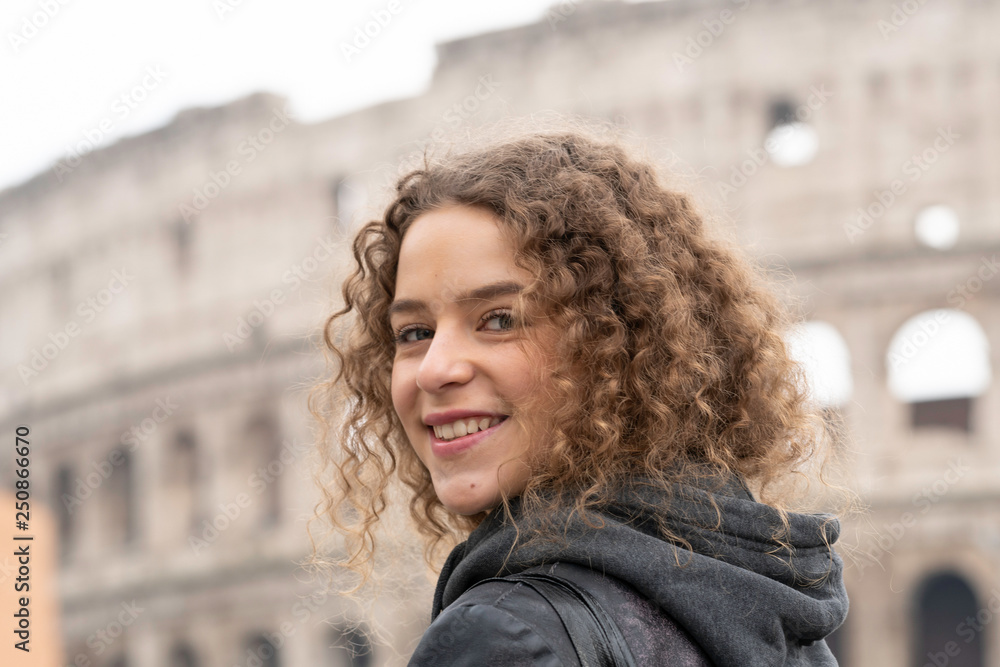 Happy young female tourist in front of the Colosseum, or Coliseum in Rome, Italy