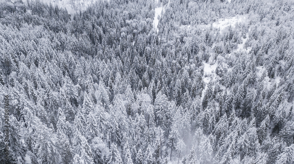 Aerial view of snow covered forest in the Sierra Nevada mountains of California.