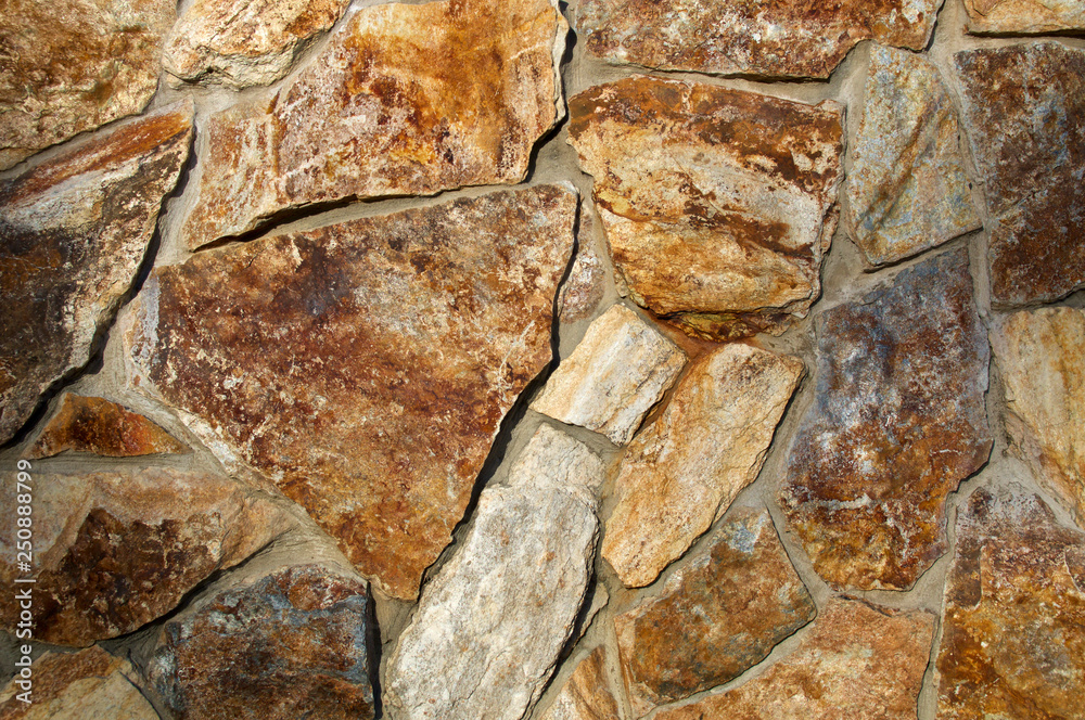 Close up of old stonewall with rocks of different shapes and sizes with deep shadows from morning sunlight..