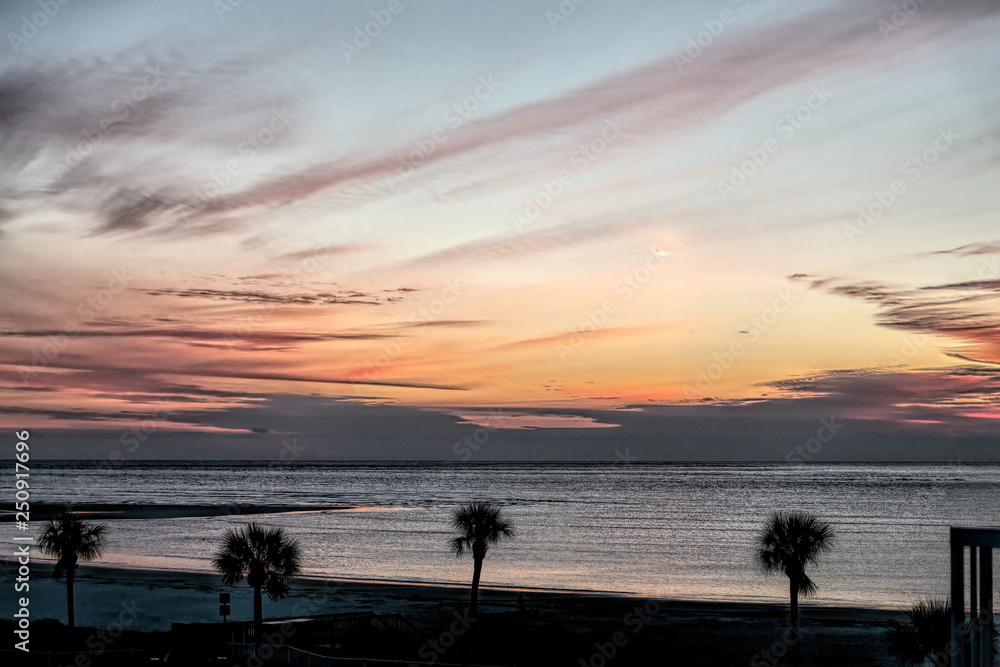A brilliant sunrise off the coast of Georgia with Palm Trees in Silhouette
