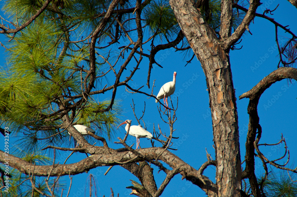 Three American White Ibis large perched in a large tall Pine Tree in bonita springs florida against a clear blue sky.