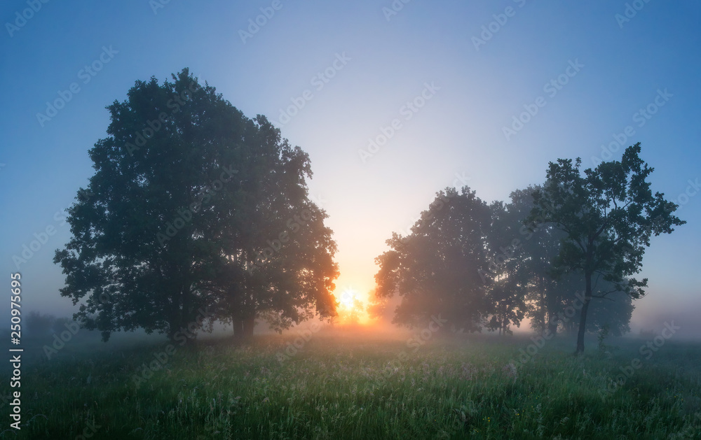 Scenic morning meadow at sunrise. Sun rises behind green trees on grassy field.