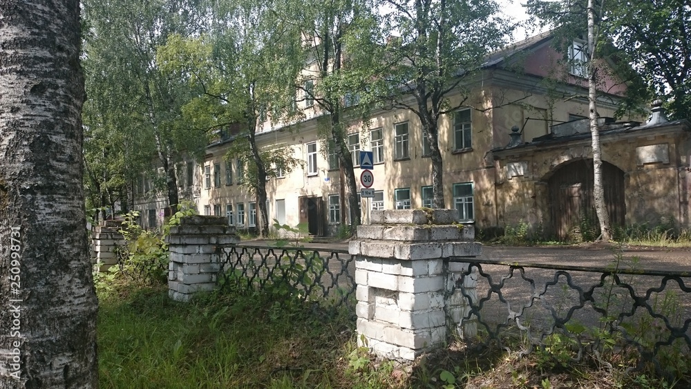 Abandoned brick and wooden houses in pishchita, located in Ostashkov, Tver region, Russia.