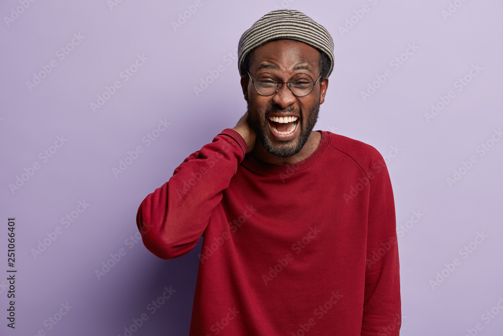 Photo of overjoyed black man giggles positively, laughs at funny joke, expresses happy sincere emotions, wears hat and red jumper, models over purple background. Fashionable hipster guy models indoor