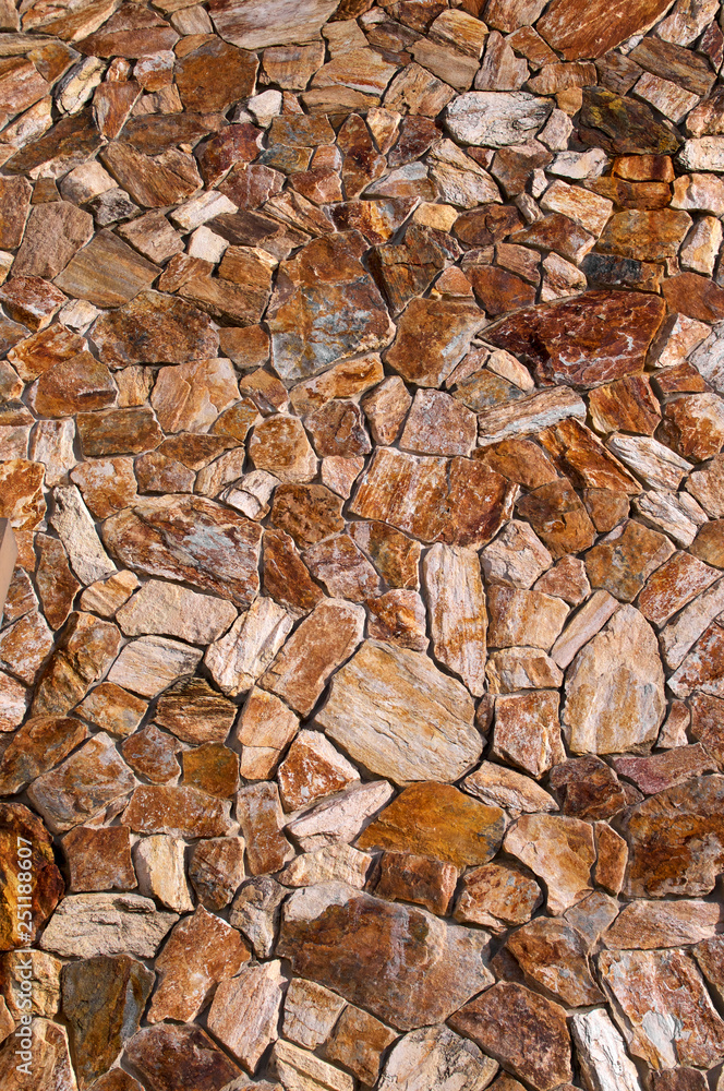 Looking up at old stonewall with rocks of different shapes and sizes.