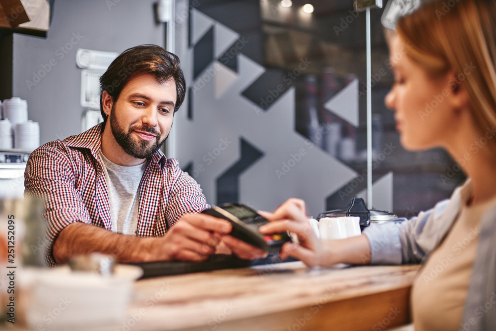 There is nothing shameful about being efficient. Small business, payment, people and service concept - woman with credit card buying coffee at cafe or coffee shop