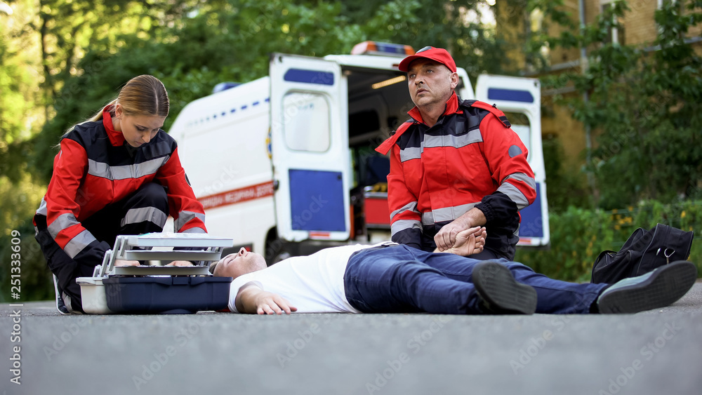 Doctor checking pulse of man lying on road, heart problems, low sugar blood
