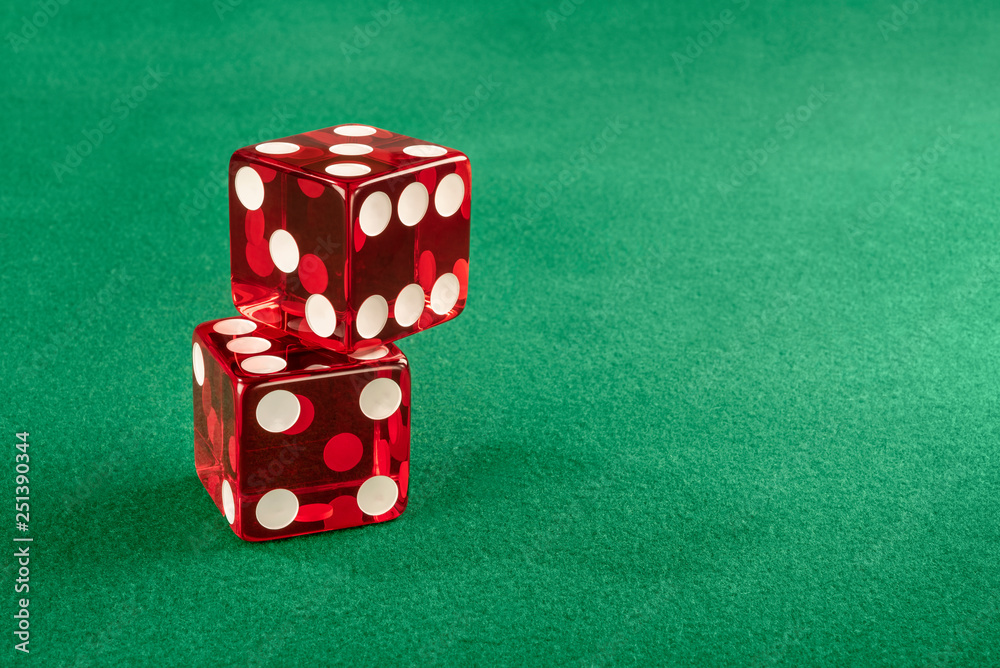 Stacked red dice in gambling table. Left positioned so you can use text on the side