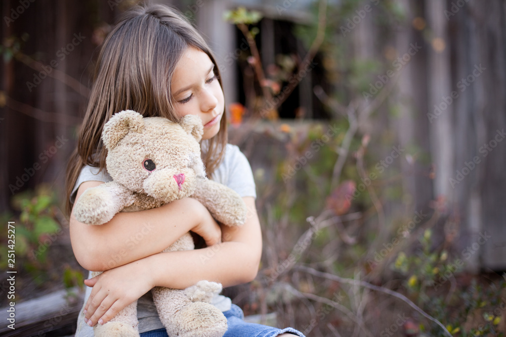 Little Girl Holding Ragged Teddybear Outside - Poverty, Homelessness