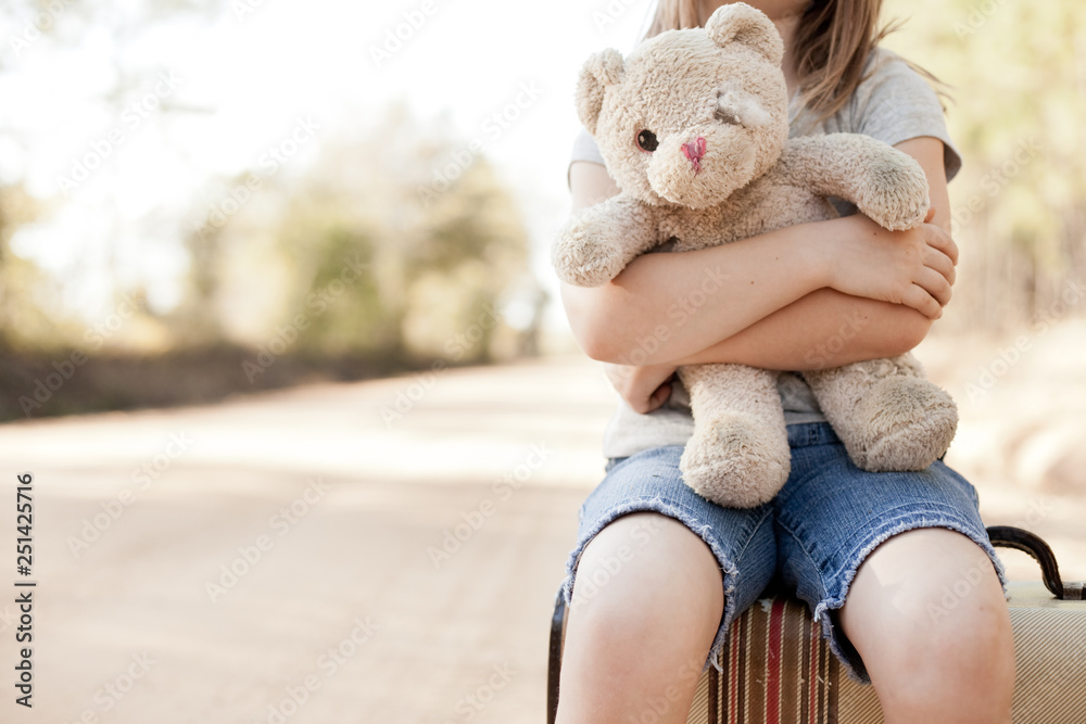 Little Girl with Ragged Teddybear and Suitcase - Poverty, Homelessness, Runaway Child