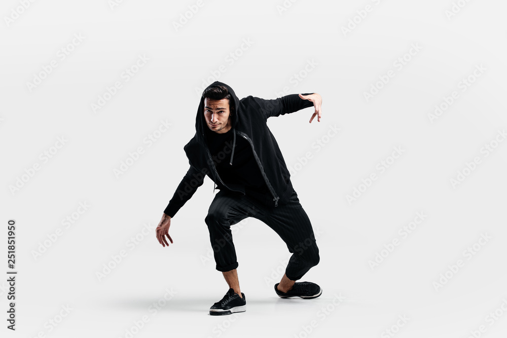 Dark-haired stylish young man wearing a black sweatshirt and black pants makes stylized movements of street dances