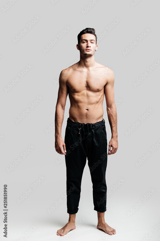 Dark-haired handsome young dancer with bare torso wearing a black sports pants is standing on a white background