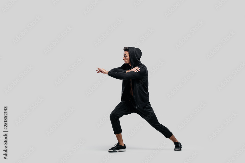 Handsome young dancer of street dancing dressed in black pants, a sweatshirt on a naked torso and a hood dances on a white background