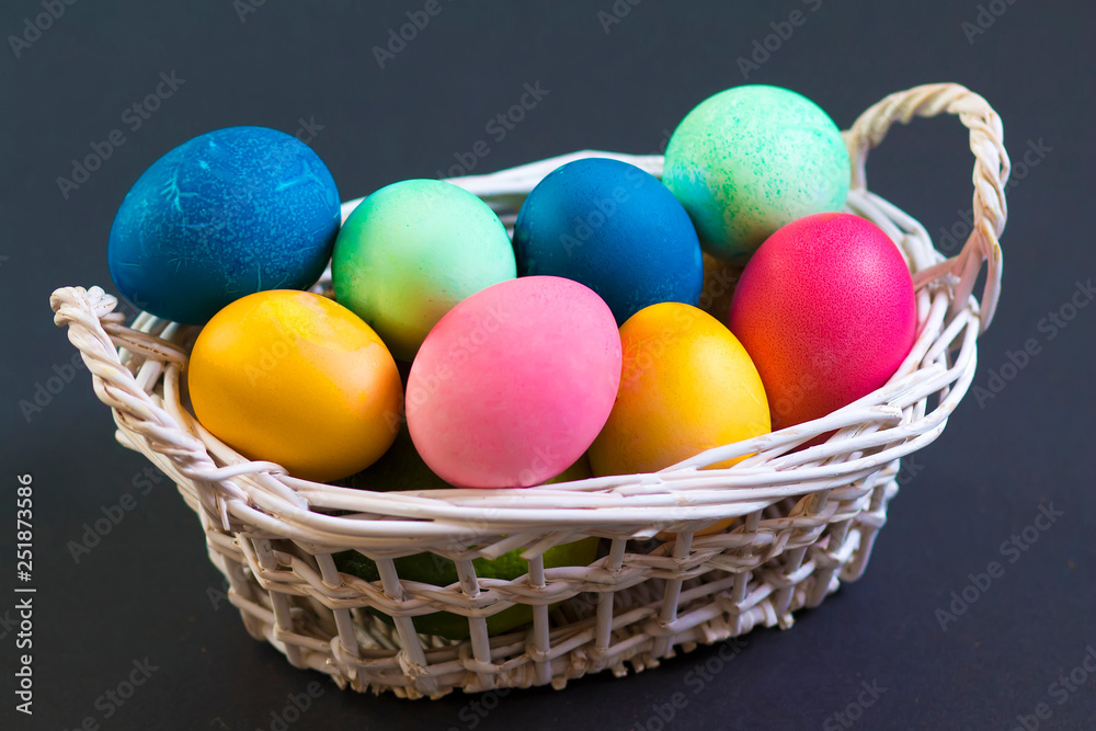 Multi colored Easter eggs in basket