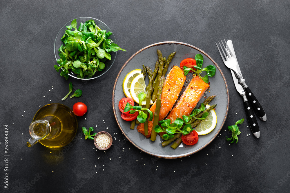 Grilled salmon fish steak, asparagus, tomato and corn salad on plate. Healthy dish for lunch. Top view