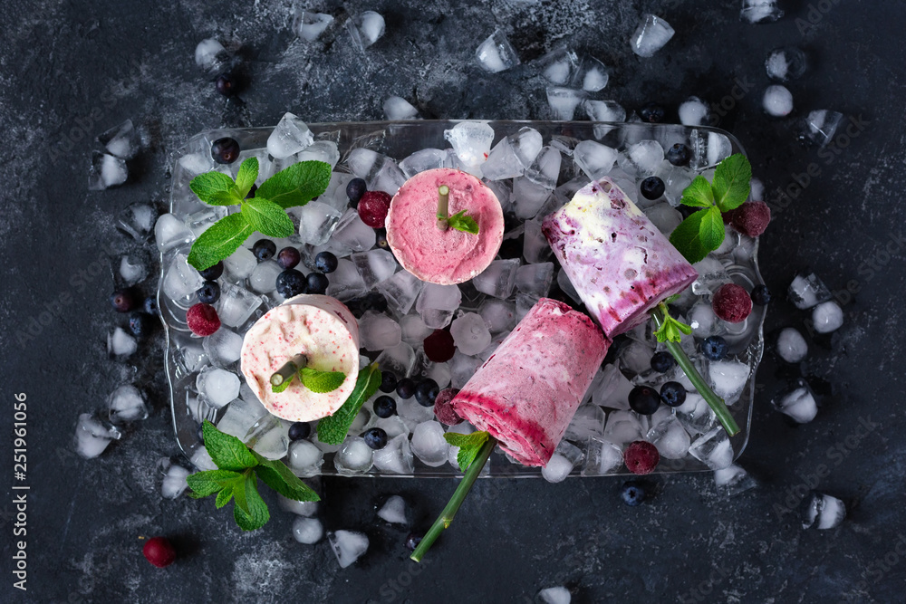 Homemade berry ice cream or popsicles decorated green mint leaves , top view