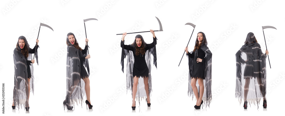 Woman with scythe isolated on white