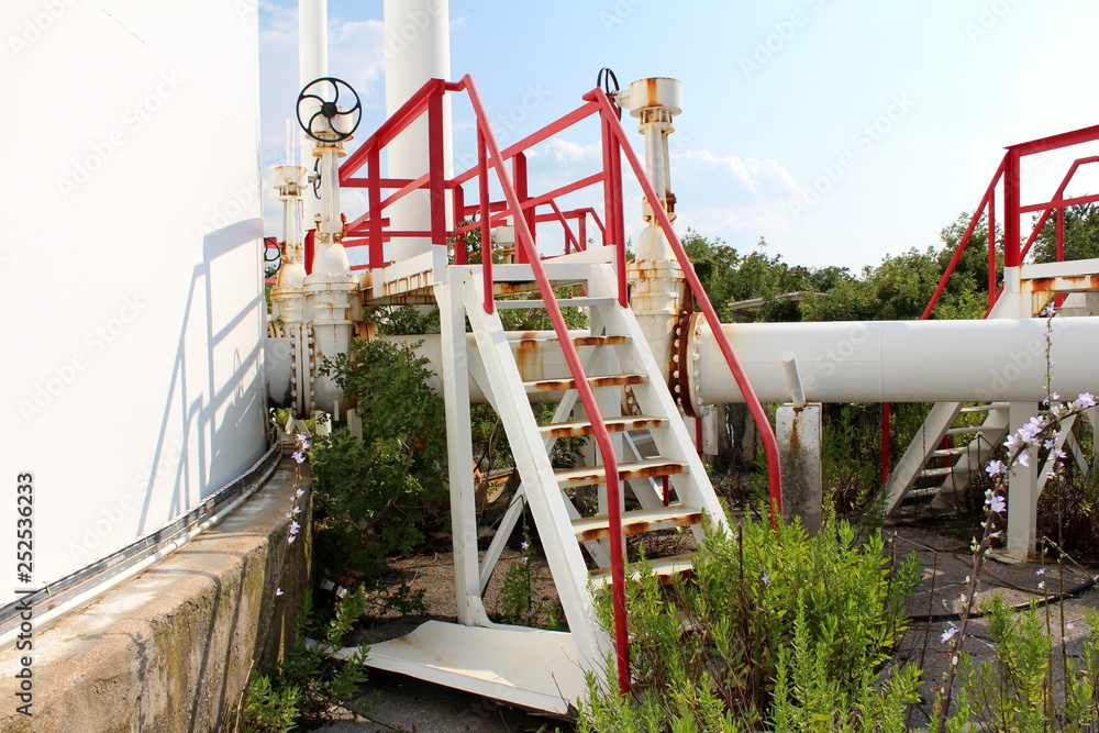 Metal platform with rusted steps surrounded with pipelines and valves at abandoned industrial complex full of small vegetation and trees with cloudy blue sky in background
