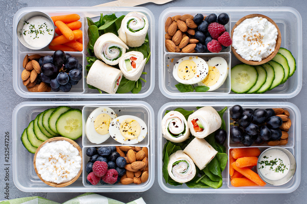 Healthy lunch or snack to go with tortilla wraps, eggs, cottage cheese, fruits and vegetables