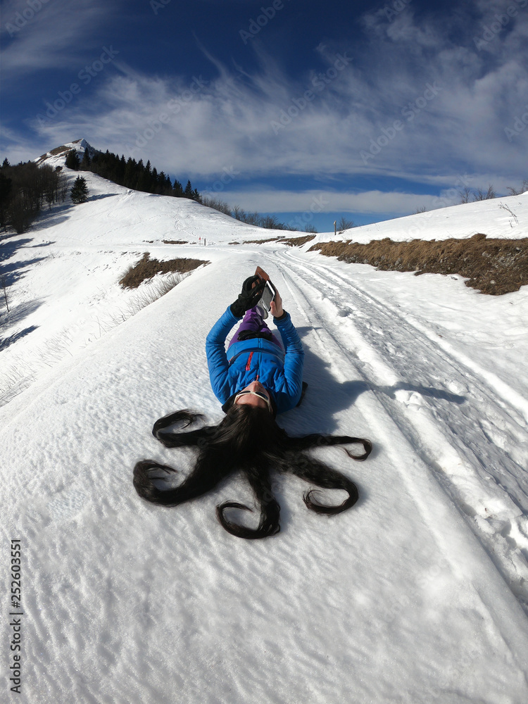 Woman with black beautiful long hair lying on the snow floor and looking to a smart phone