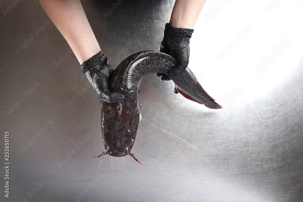 Sum afrykański. Świeża ryba. Kobieta trzyma w dłoniach rybę