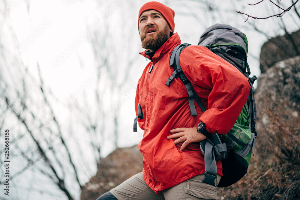 Portrait of young male hiking in mountains wearing red clothes exploring new place. Traveler bearded man trekking and mountaineering during his journey. Travel, people, sport and lifestyle concept