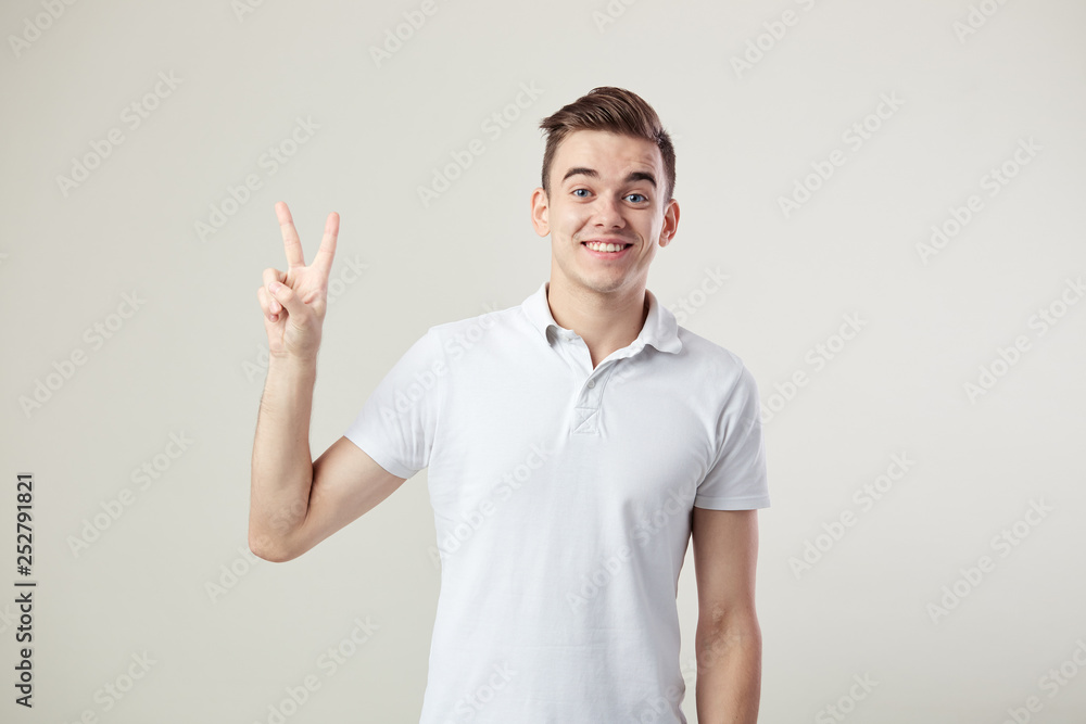 Affable guy dressed in a white t-shirt and jeans shows V sign on a white background in the studio