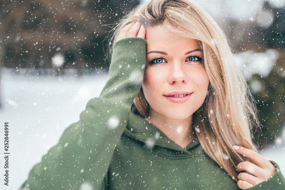 Beautiful young woman with a dreamy facial expression straightens her hair - an external portrait in the winter in the snowfall - is dressed in hoodie