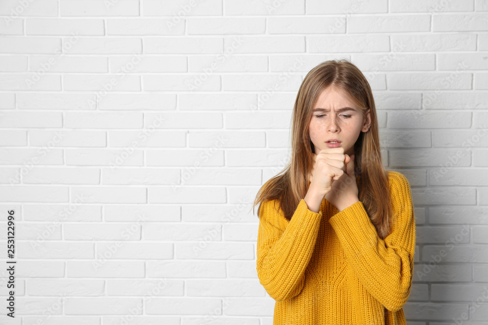 Teenage girl suffering from cough near brick wall. Space for text