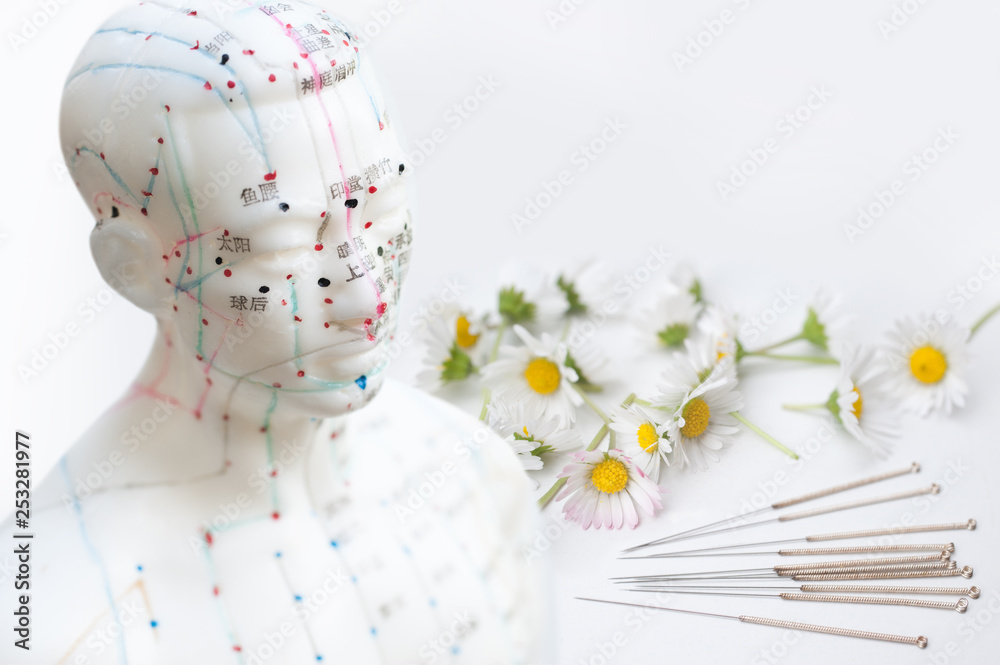Akupunkturmodell, Akupunkturnadeln und Gänseblümchen