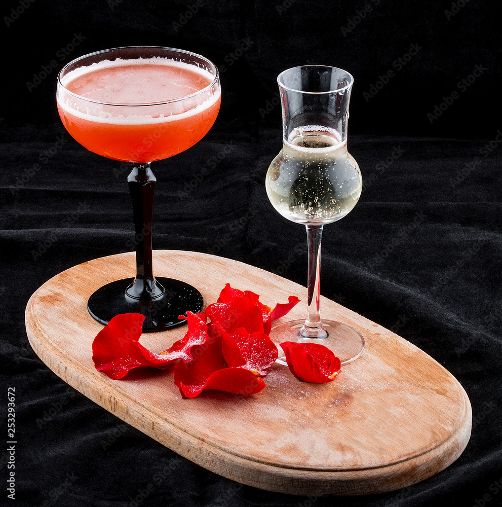 Exquisite cocktail in a glass on a wooden Board. Dark background.