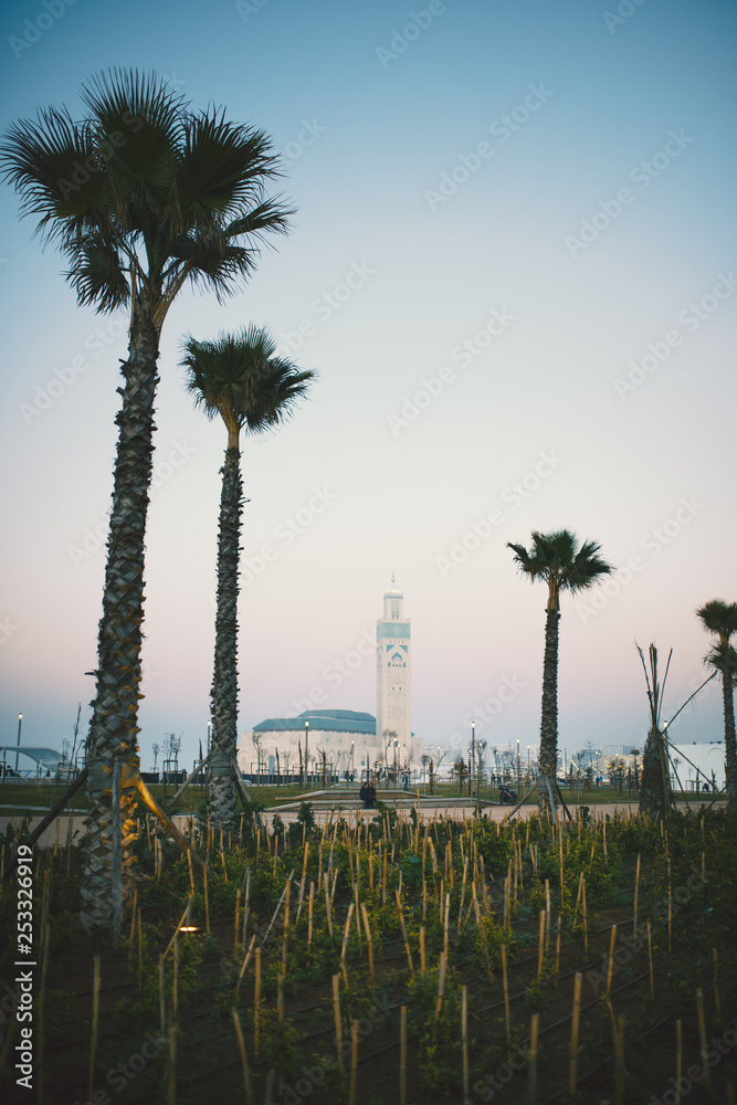 The largest Mosque in Morocco during a sunset. The Hassan II Mosque. Beautiful sunset in Casablanca.
