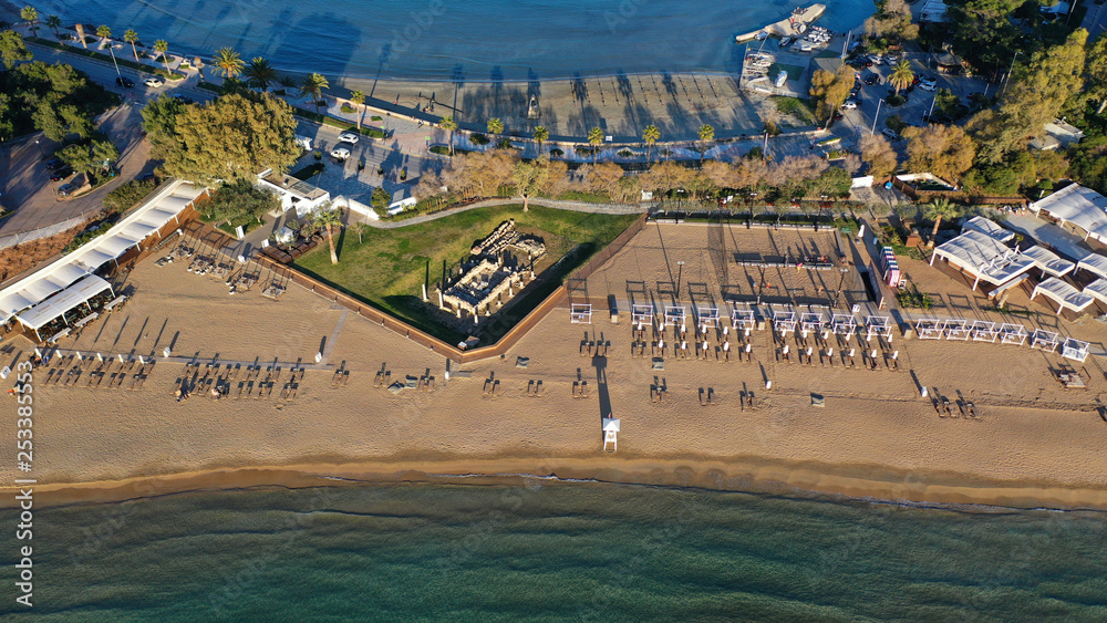 Aerial drone photo of iconic turquoise sandy celebrity beach of Asteras or Astir and ancient temple of Apollo Zoster, Vouliagmeni, Athens riviera, Attica, Greece
