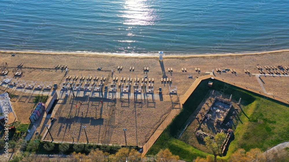 Aerial drone photo of iconic turquoise sandy celebrity beach of Asteras or Astir and ancient temple of Apollo Zoster, Vouliagmeni, Athens riviera, Attica, Greece