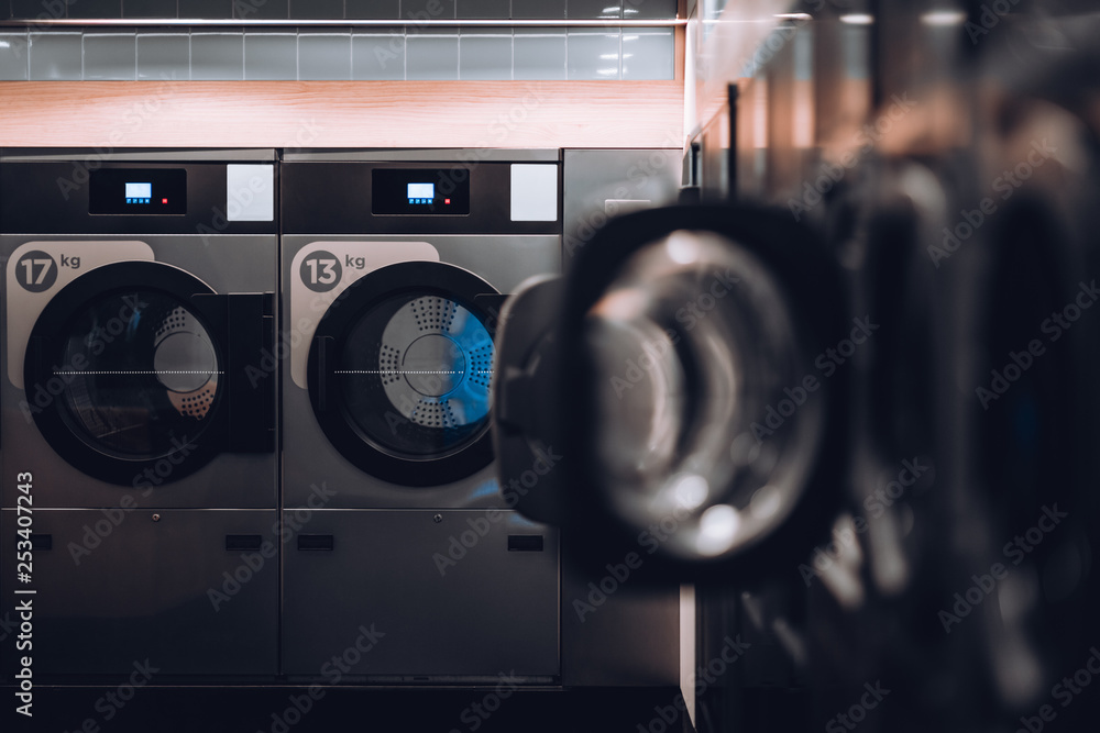 A dark modern room of a publiс laundry with perpendicular rows of washing machines with some of the doors opened and tumble dryers, selective focus on the far wall, shallow depth of field