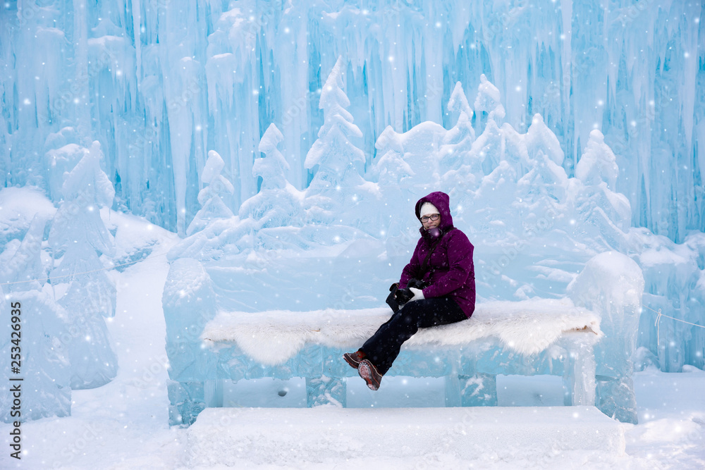 woman sitting on an ice bench at the ice castles