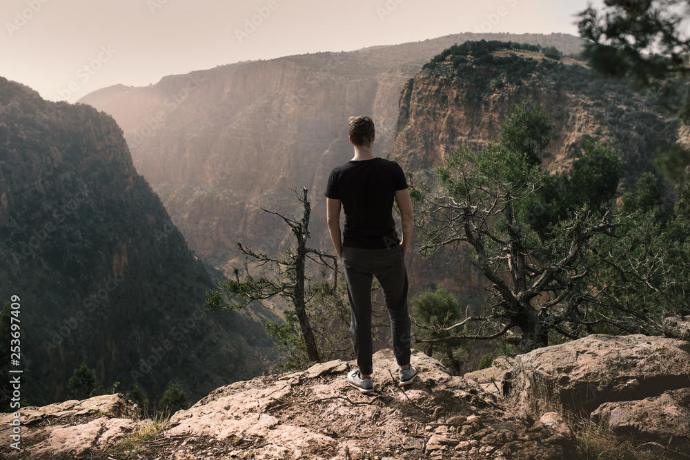 Tourist man on a top of mountains in a canyon. Sunset view. Nature. Tourist people enjoy a moment in a nature. Morocco nature.