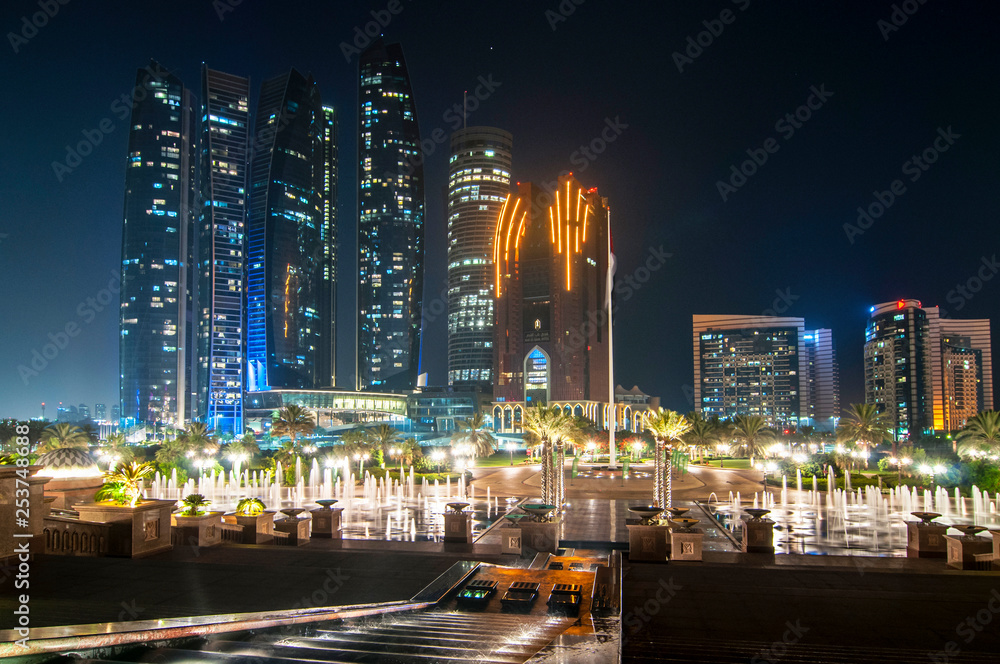 Skyscrapers of Abu Dhabi at night with Etihad Towers buildings. Abu Dhabi is the capital and the second most populous city of the United Arab Emirates.