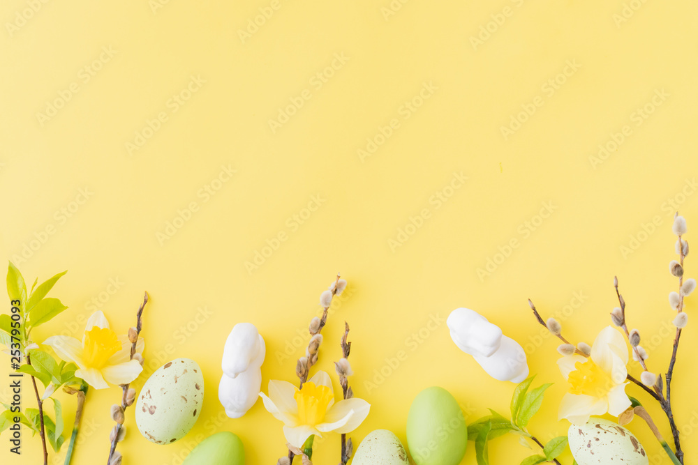 Flat lay easter composition with yellow daffodils and eggs on a yellow background