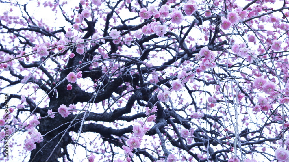 下から見上げたしだれ梅 曇り 農業センター クールイメージ