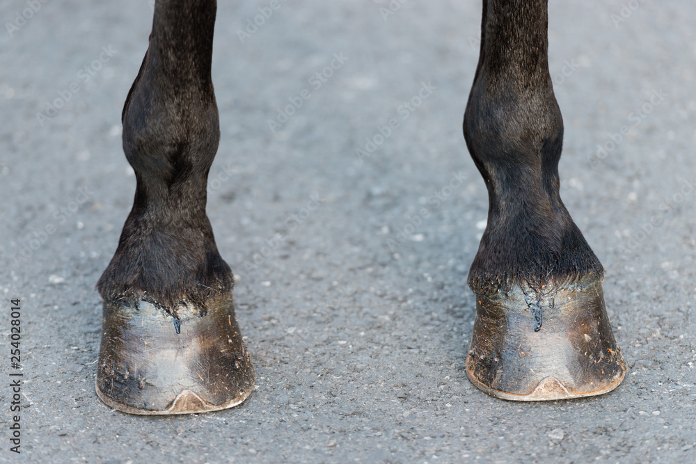 Detail of the hooves of a black horse