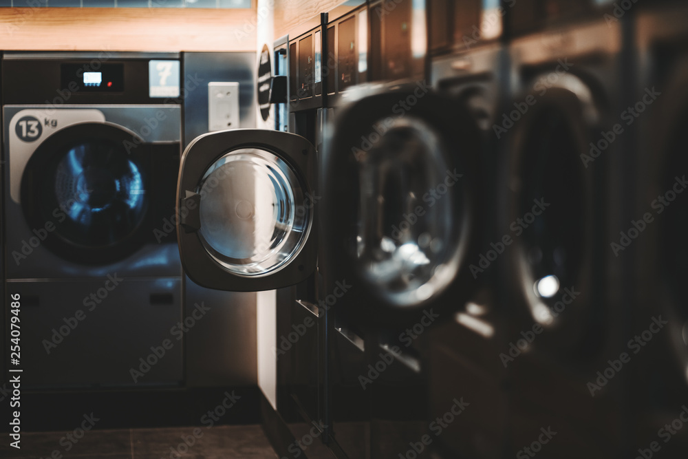 A dark laundry room with multiple wall embedded washing machines and dryers of different models and capacity, some washers doors are opened; selective focus, shallow depth of field, strong bokeh