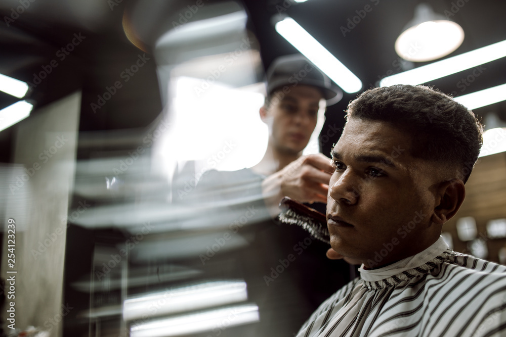 The fashion barber in black clothes makes a razor cut hair for a stylish black-haired man sitting in the armchair in a stylish barbershop