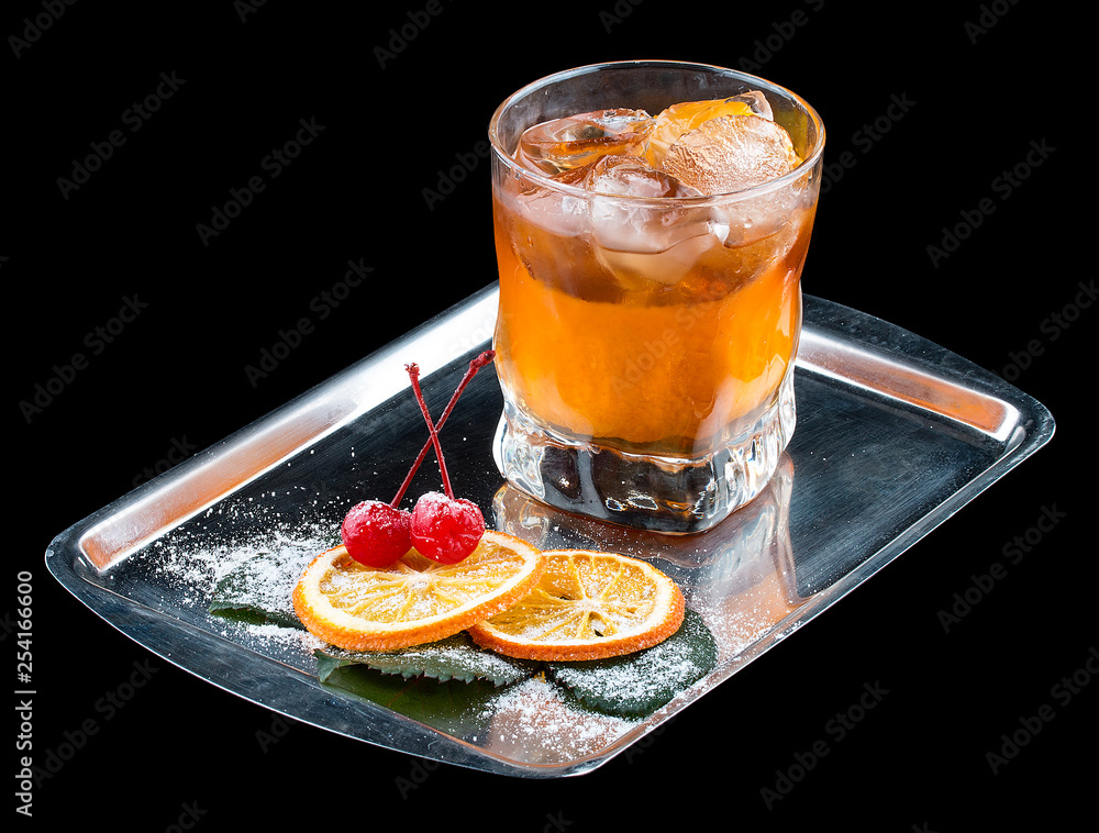 Exquisite cocktail with citrus chips on a tray. Dark background.