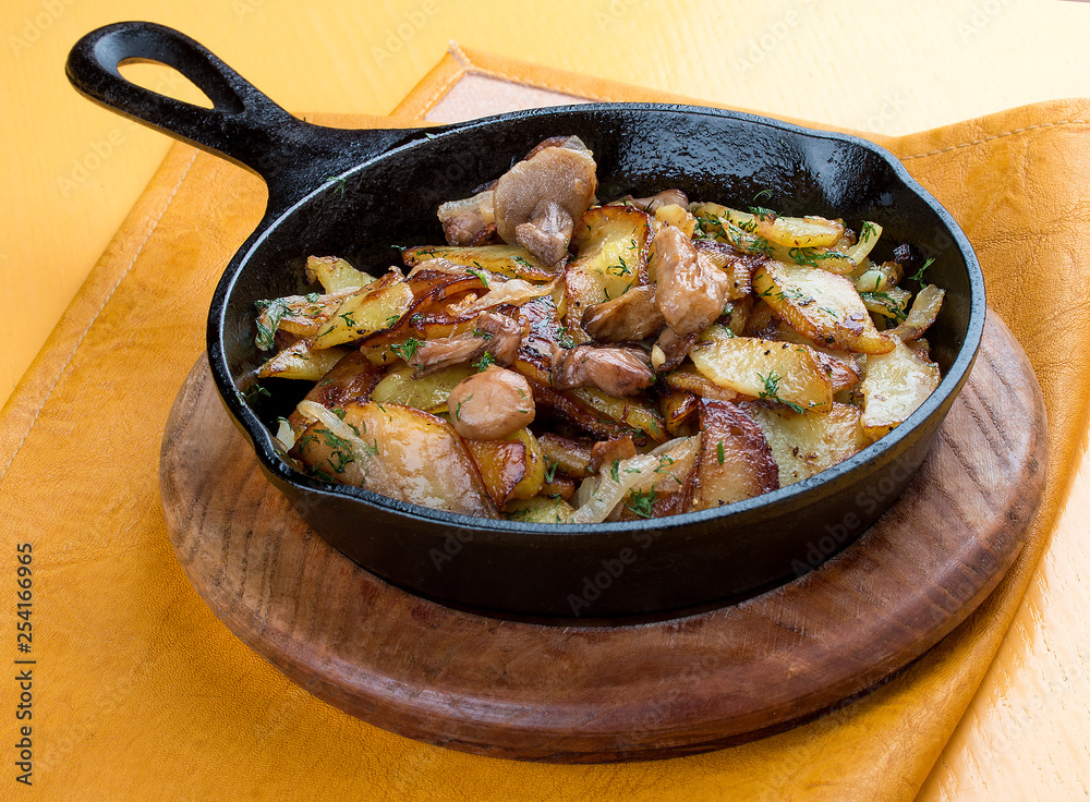 Fried potatoes with mushrooms in a cast iron pan
