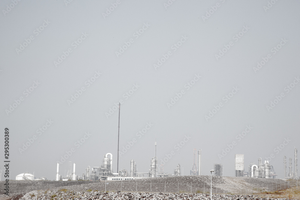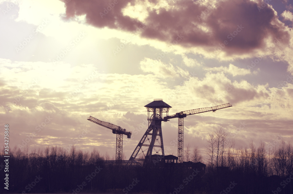 Silhouettes of old coal mine tower and two cranes against dramatic skyscape in Genk, Belgium. Industrial construction and mining concept.