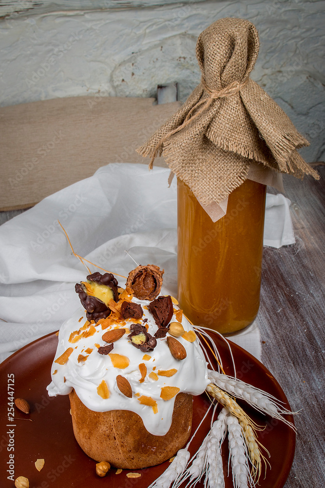 Decorative Easter basket with cake, colored eggs and liqueur. On a wooden table