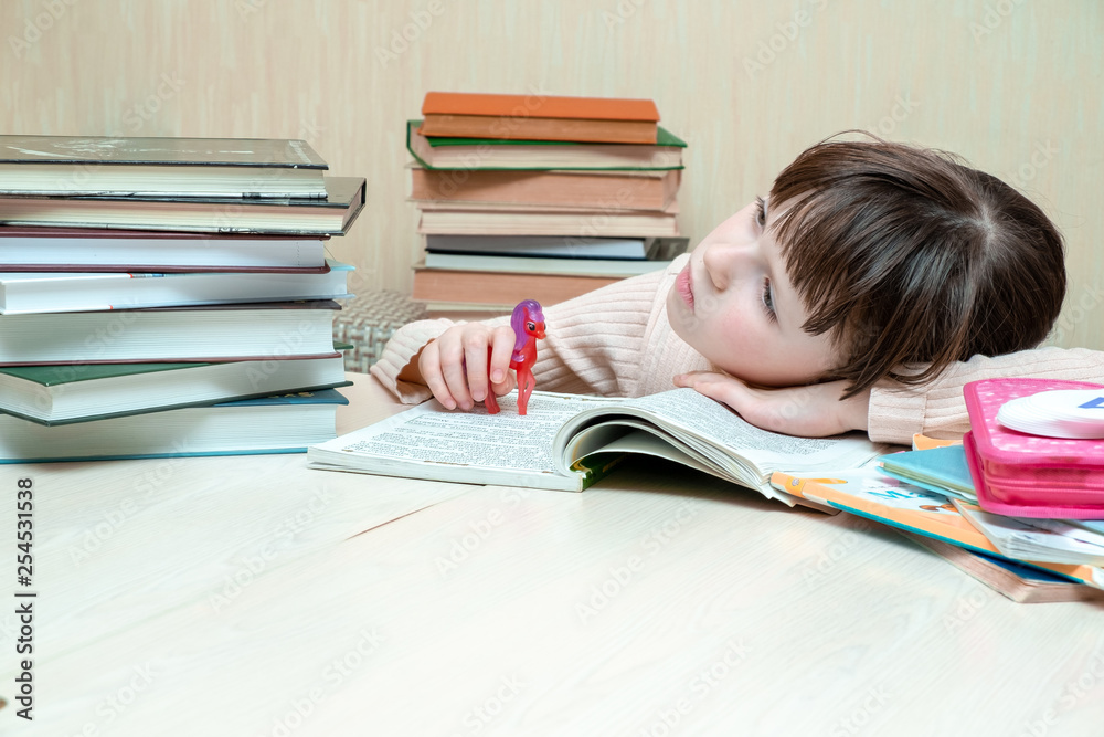 SThe schoolgirl laid her head on the book and thoughtfully looks into the distance. A child holds a toy horse in his right hand