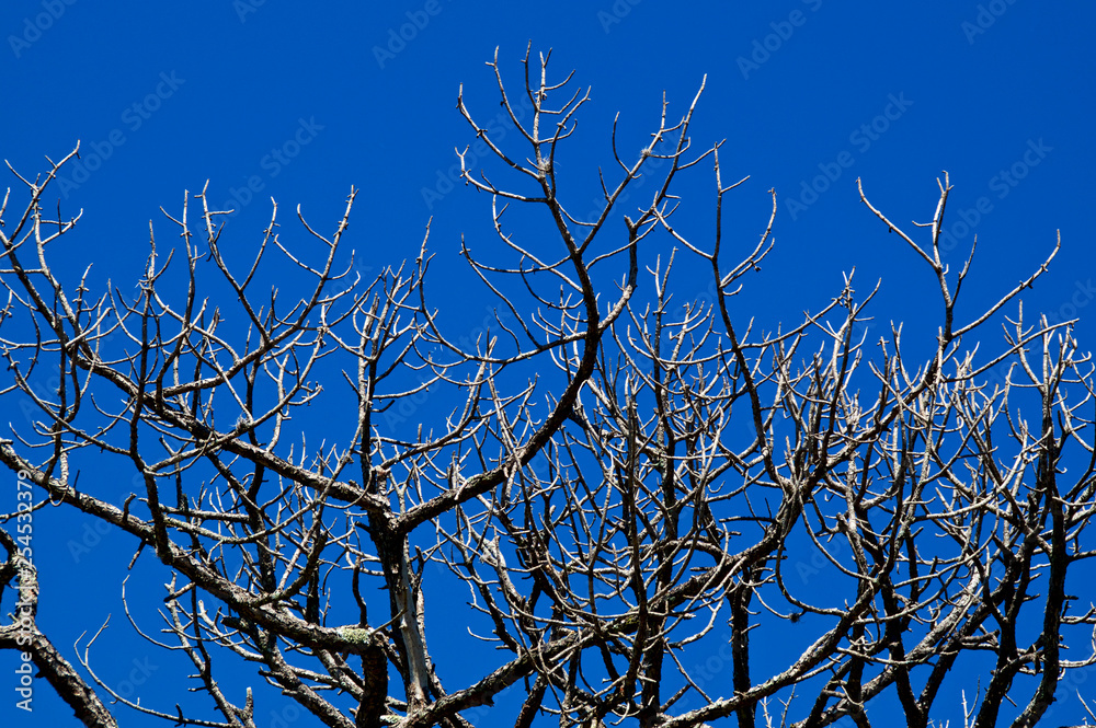 Looking up at bare pine trees that appear to be dead with deep shadows and clear blue sky.