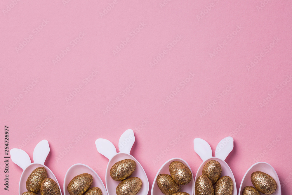 Gold glitter eggs in a white easter bunny egg shape with ears